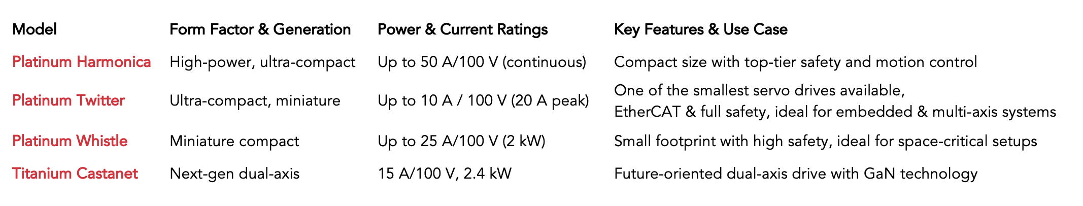 A miniature yet powerful member of the Platinum series. Up to 25 A / 100 V (9 A at 200 V), delivering up to 2 kW continuous (4 kW peak). Despite its small size, it integrates full functional safety, safety-over-EtherCAT, and optional safe I/O. Touches all major highlights of the Platinum series: lightning-fast networking, high processing, and flexible feedback support.